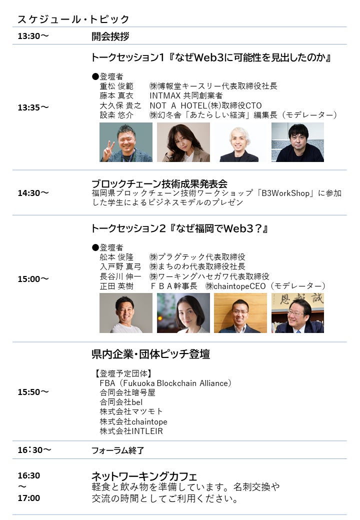 この度、ブロックチェーン技術に対する認知度の向上や、導入を促進するため、世界や日本でブロックチェーン技術を使ったweb3事業を推進する先駆的な企業や福岡県内で活躍する企業のキーマンによるトークセッションを中心としたフォーラムを開催します。