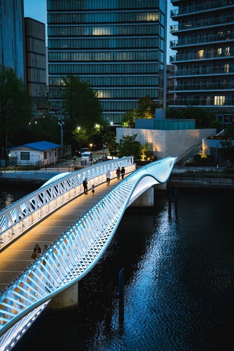 勝どき駅と晴海三丁目を結ぶ歩行者専用橋「黎明小橋(れいめいこばし)」は、2024年3月25日に開通しました。朝潮運河をまたぎ、勝どきエリアの新たな賑わいと憩いの場として広大な緑地と水辺を抱く街「GRAND MARINA TOKYO」へとつながる同橋は、水面に波打つような柔らかな曲線のデザインが、おだやかな波のイメージを表現しています。連続する白い部材を水上に浮かべる構成により、繊細な動きが水面のきらめきと重なり、ウェーブの美しさを際立たせています。さらに、水面に映り込む橋の姿は、重なり合ういくつもの波を思わせます。