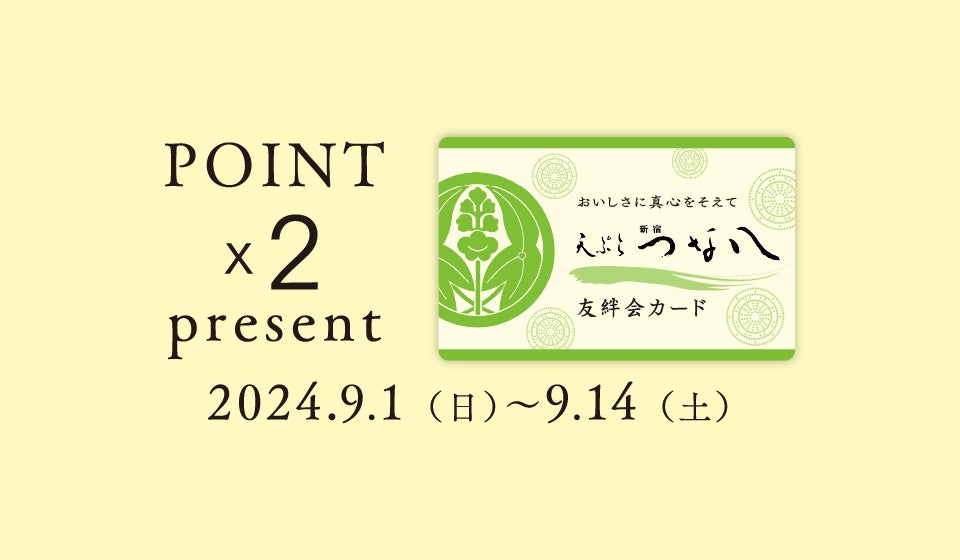 「天ぷら新宿つな八」を主に、天ぷら専門店を展開している 株式会社綱八(本部:東京都中野区、代表取締役:志村久弥)は、2024年10月に創業100周年を迎えます。「おかげさまで100周年、これからの100年へ」を合言葉に、2024年6月から2025年5月の1年間にわたり全店で、新宿つな八を支えてくださった全ての方へ感謝を込めた記念企画や商品を販売しています。つな八が100年間培ってきた独自性や技術を活かした天ぷら文化を発信し、皆様との絆をさらに深めてまいります。楽しい企画や、期間限定メニューは「つな八100周年特設WEBサイト」( https://www.tunahachi.co.jp/100year/ )にてお知らせしていきます。9月は「ダブルポイントキャンペーン」、「ビール祭り」を開催、「特別盛り合わせ」を販売いたします。