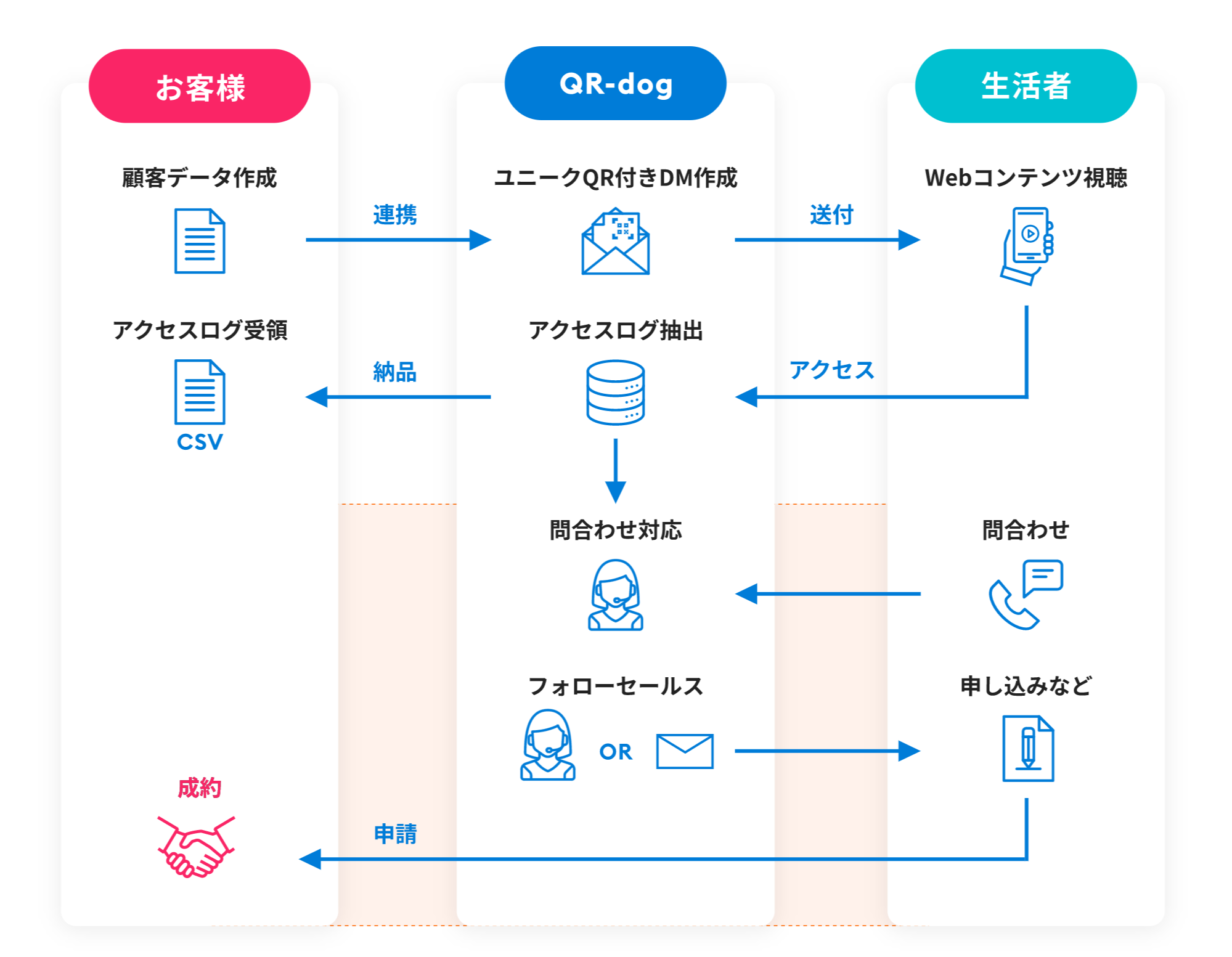 本サービスは、DMにユニークQRコードを付与することで、顧客単位で反応が追跡できるシステムです。さらに、アクセスログを活用し、顧客反応に応じた営業優先リストの作成やDMマーケティングのPDCAサイクルの迅速化に活用することが可能です。