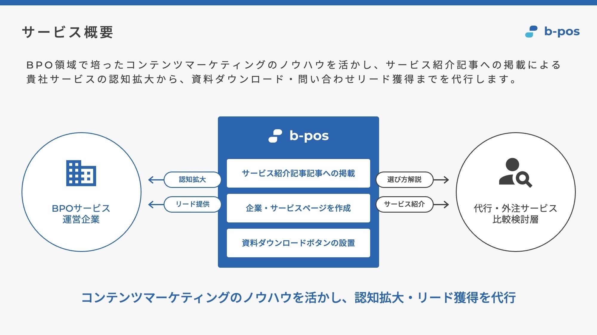 b-posは、BPOサービスを、導入を検討している発注者に、様々なコンテンツで紹介する業界初(※)の「BtoBの代行・外注サービスの比較サイト」です。