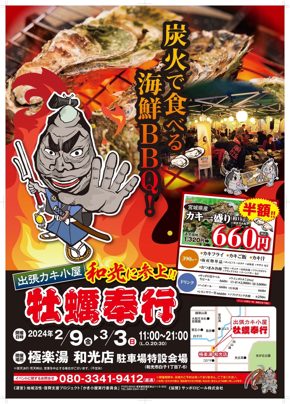 「和光に牡蠣奉行が帰ってきた!」出張かき小屋が埼玉県和光市にカムバック出店「地域活性・東北復興支援プロジェクト 出張カキ小屋 牡蠣奉行」が極楽湯和光店で短期出店(2/9-3/3)