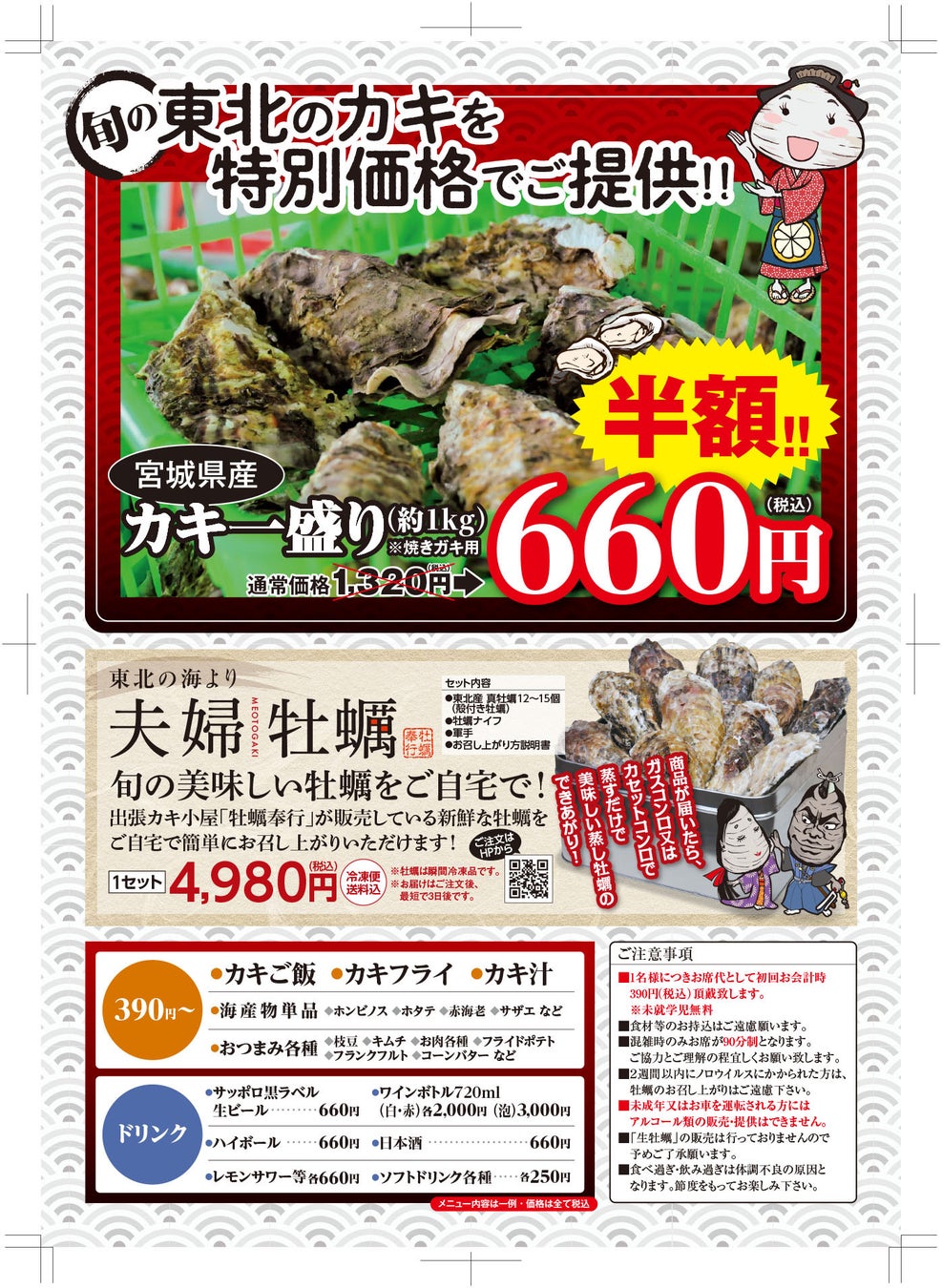 牡蠣は「石巻産殻付き真牡蠣」(約1キロ=殻付き4~6個)通常1,320円を東北復興支援価格として1盛り660円で提供するほか、「北海道産牡蠣」(約3個)「瀬戸内産牡蠣」(約6〜10個)(以上通常1,320円を1,200円で販売)を用意。