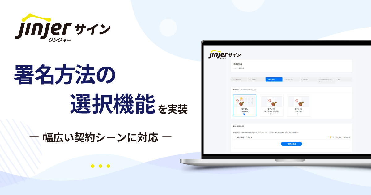 jinjer株式会社(本社:東京都新宿区、代表取締役CEO:加藤 賢)が提供する、バックオフィス向けクラウドサービス「ジンジャーサイン」に、署名方法の選択機能を1月21日(金)から正式に実装することをお知らせいたします。