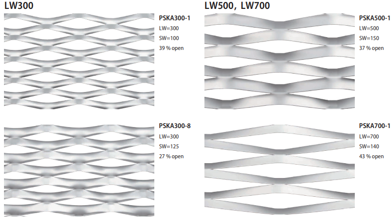 PRO-FIT エキスパンドメタルは、従来のエキスパンドメタルより外装材・意匠材として適した仕様にカスタマイズした製品です。目の大きさ(LW、SW ※1)や送り幅、ボンド(※2)部分の長さなど、各部位の数値を変化させることで網目パターンを成型し、LW300を超える大柄な網目や一枚板の中で打ち方を変更できるグラデーションメッシュなど、独自性の高いパターンを豊富に揃えています。