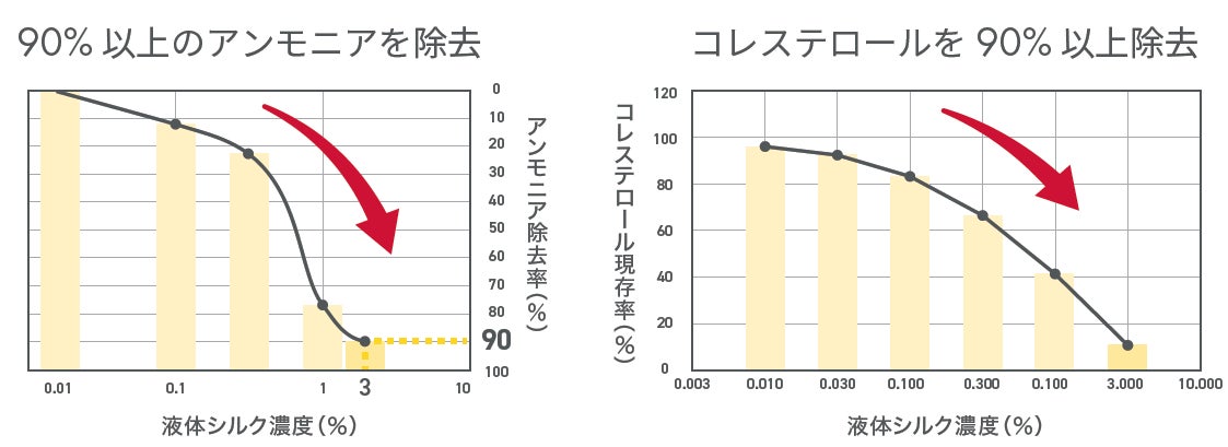 ナノレベルのカラダシルク®が多孔質構造により、アンモニアとコレステロールを90%以上除去できるエビデンスがございます。腸管内の老廃物を吸着し排泄物と一緒に体外へ排出されます。