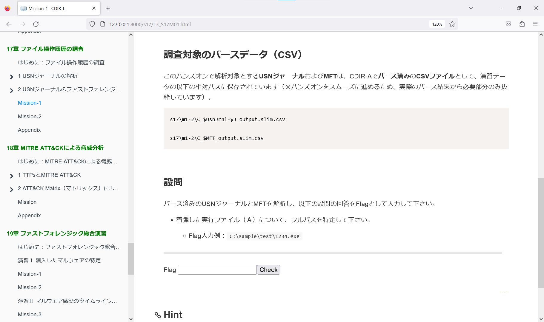 各章に複数のハンズオンとCTF形式のミッションを設けており、実習用の演習データをパッケージしています。 実際に手を動かして模擬調査を行うことにより、様々な解析ツールを活用した実践的な技術スキルを修得できます。