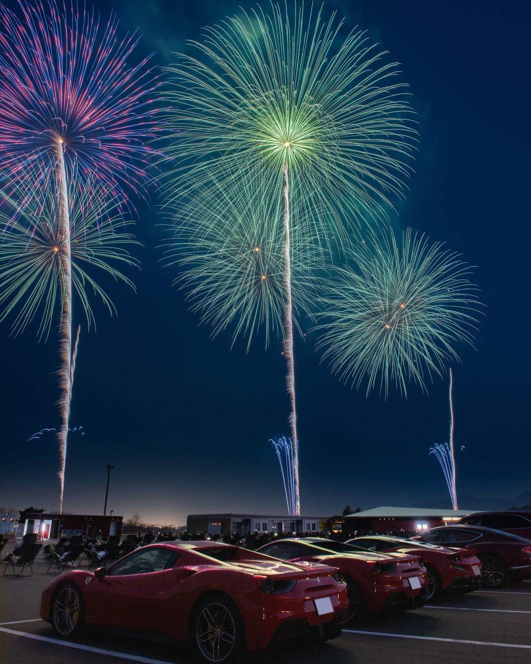 「春の夜空に、花火は何を描くのか。」1.5kmのホームストレートをフルに使った花火や、過去の大会では揚げられなかった大輪の一尺玉、内閣総理大臣賞受賞花火師による最高技術の花火など。春の富士裾野・スピードウェイを舞台に、大小様々な花火が打ち揚がりました。