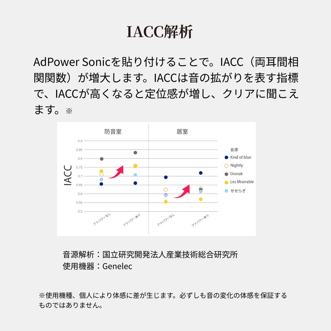 特許取得済みの車輌用アドパワーシリーズで使用している静電気除去技術をもとに、オーディオ専用製品として開発されたのが『アドパワー・ソニック』です。国立研究開発法人産業技術総合研究所における音源解析で、アドパワー・ソニックを貼り付けることで、IACCが増大する傾向があることがわかりました。