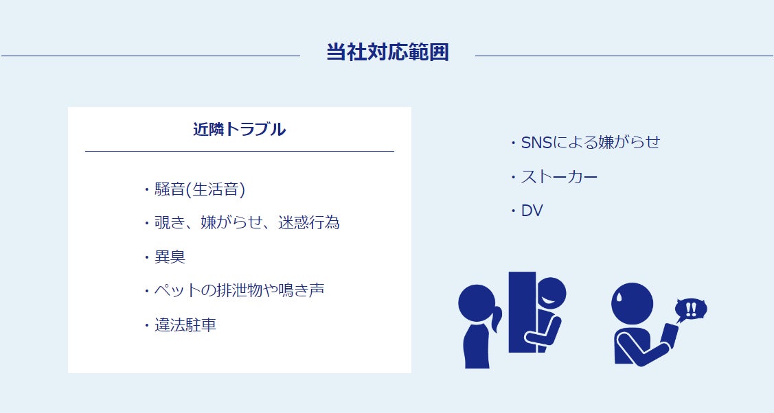 「騒音」「迷惑行為」「不法侵入」「ストーカー・DV」「SNSによる誹謗中傷」など、「根本解決が難しい、事件未満の軽微なトラブルに介入できる第三者」を担うものです。トラブルの芽を摘むための迅速な介入、培われた知識と対応能力、鍛えられたストレス耐性、6年間で積み上げてきたノウハウにより解決に至っていないトラブルに寄り添います。