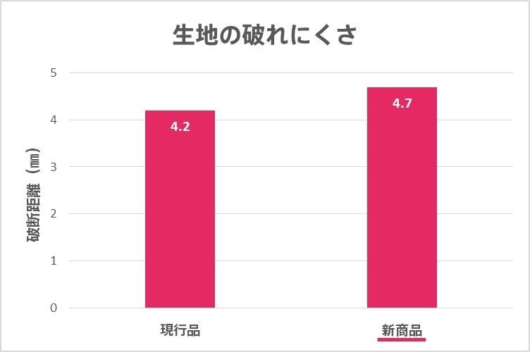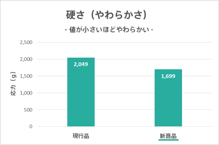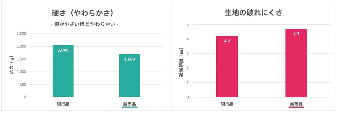 生地がどれほどもちもちなのか、既存商品のクレープ皮と比較するため、テクスチャーアナライザーで生地物性を測定しました。結果は、既存商品よりも本商品の方が応力(硬さ)が少なく、やわらかいという結果に。一方、生地の破れにくさを比較すると、破断距離(しなやかさ)の数値が伸びていることから、破れにくさがアップしていることが分かります。この“やわらかさ”と“破れにくさ”が「ファミマ・ザ・クレープ」の絶妙なもちもち食感を実現させています。