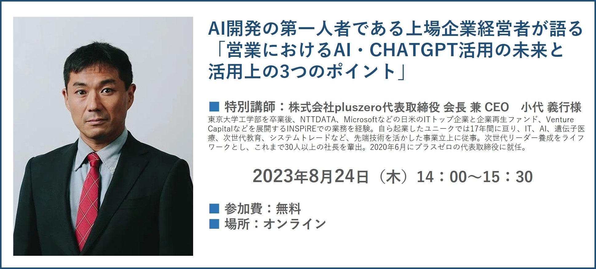 本セミナーでは、2022年に東証グロース市場に上場を果たしたAI開発の注目企業である株式会社pluszeroの代表取締役会長兼CEOの小代義行様にご登壇頂きます。AI開発の第一人者である小代様が、営業におけるAIとCHATGPTの活用の未来を熱く語ります。