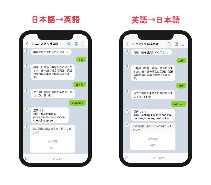 ご自身の学びたいレベルの英検の級を選択し、「英語→日本語」もしくは「日本語→英語」に、AIが出題する単語を訳してLINE上で答えていきます。