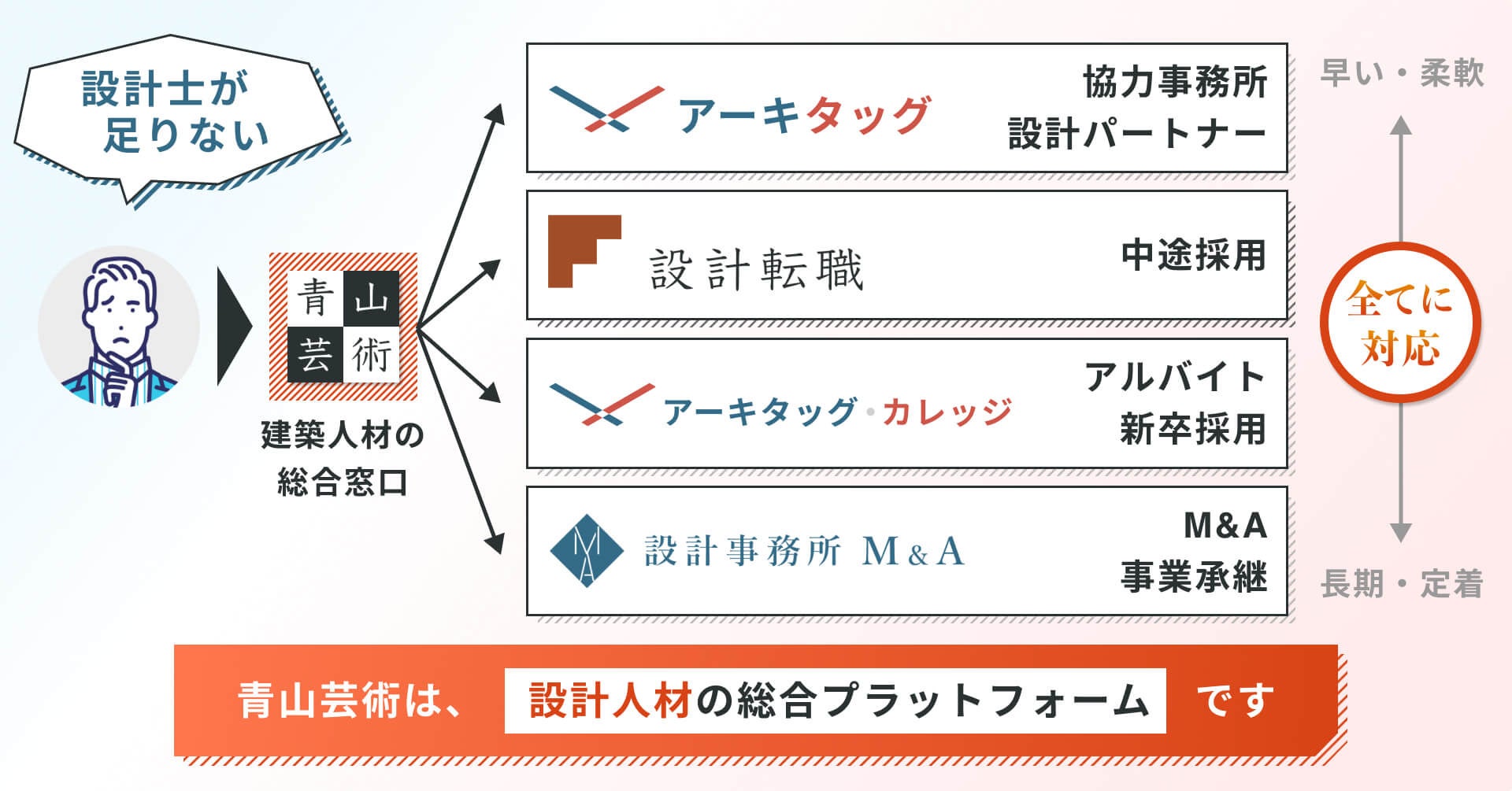 「アーキタッグ」で短期的かつ柔軟な設計パートナーの確保を、「設計転職」で着実な中途採用を、「設計事務所M&A」で人材やスキルの大幅な獲得を実現することができるようになり、国内最大級の独自データベースを活かした建築人材の総合窓口として、青山芸術はあらゆる企業の設計士不足解消に取り組んでいきます。
