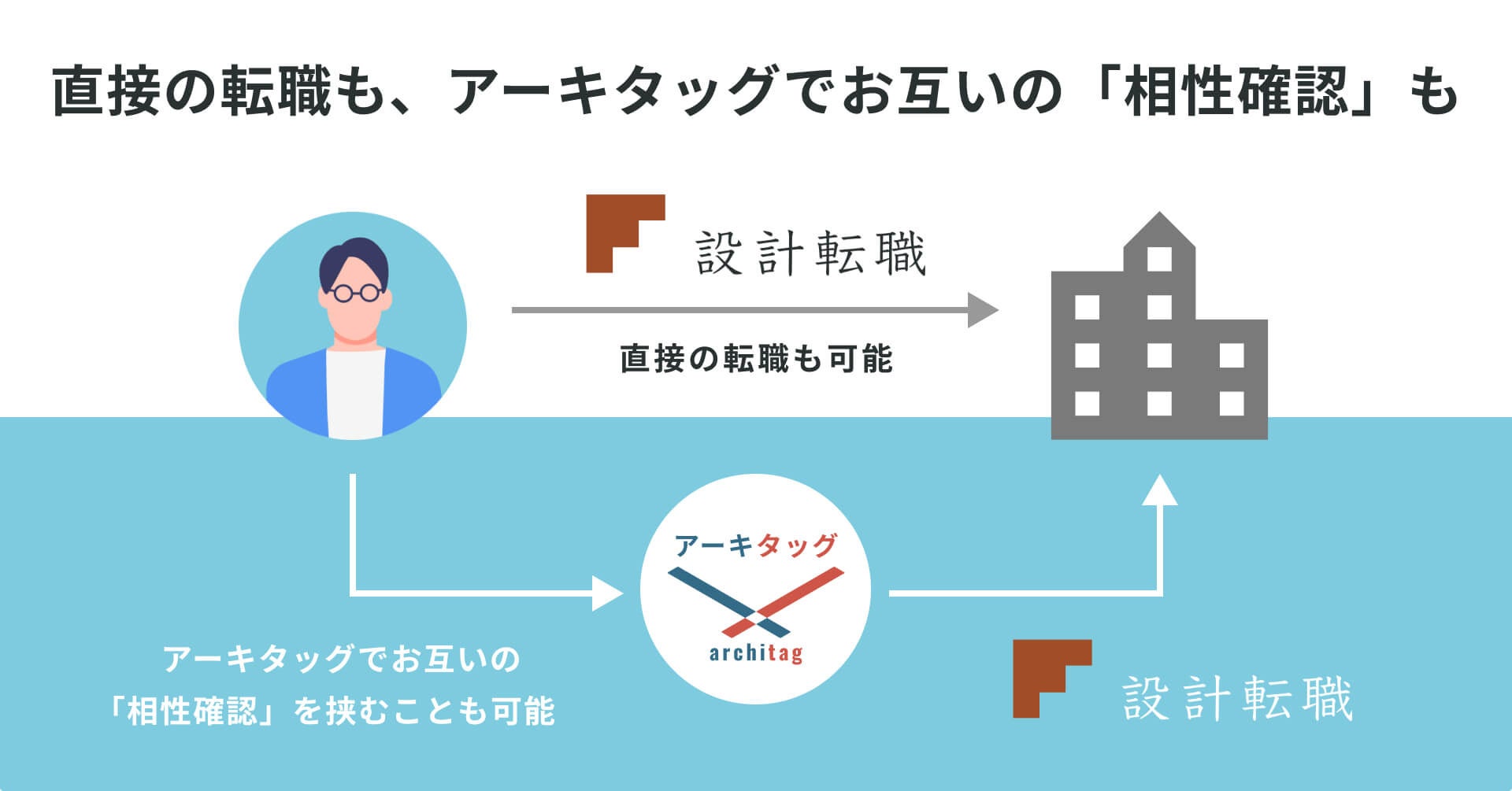 単なる人材紹介にとどまらない、アーキタッグの登録データや評価実績を活用した精緻な求人マッチングに加え、転職活動中の設計者・フリーランスのデザイナー・再就職を検討している建築士などは、アーキタッグを通じた「相性の確認」を経て転職のソフトランディングを促進することもできる新しい転職支援サービスです。