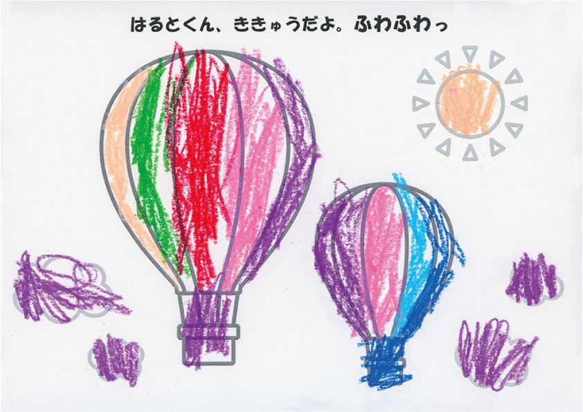 「〇〇くん、ひこうきだよ。ビューン!」など、塗り絵用紙すべてにお子様の名前とともに、「ブーン」「ドサーン」など乗り物の動く音を記載しています。言葉の意味がまだよく分からない幼児も、音やリズムから少しずつ言葉を覚え、感性が養われます。塗り絵を終えた後は、読み聞かせを通じて、親子のコミュニケーションを深められます。