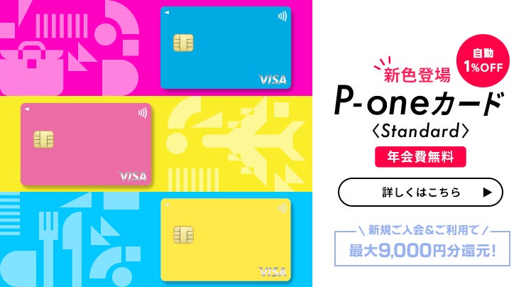 毎日のお買い物が請求時に1%OFFとなるP-oneカードのお得な特典はそのままに、年会費永年無料・盗難、紛失保障付帯・WEB入会限定のおトクなクレジットカードです。