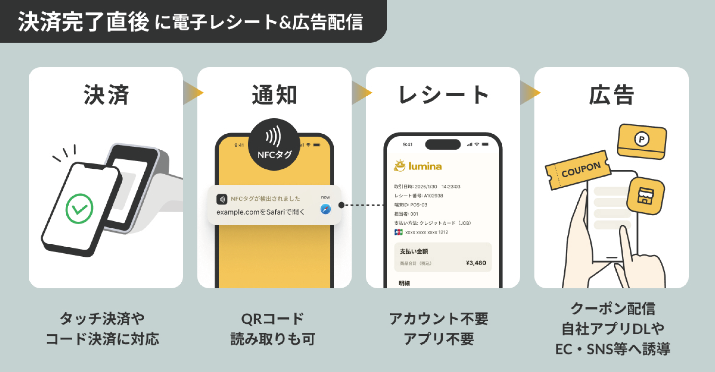 決済完了直後という、顧客との接点価値が最も高い“高接触タイミング”に、クーポン配信や再来店促進の情報をスマホへ確実に届けます。