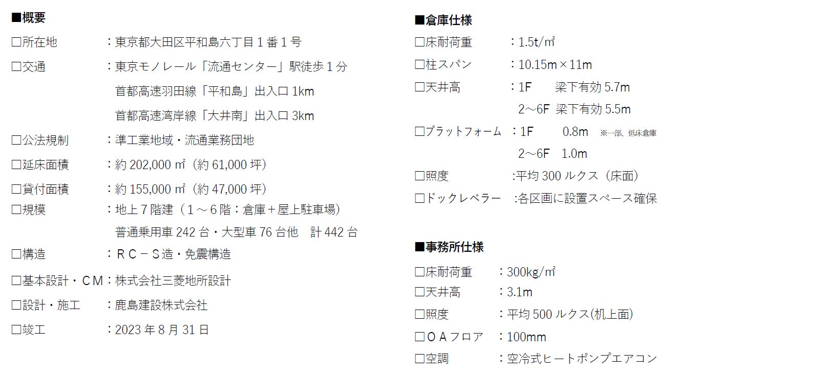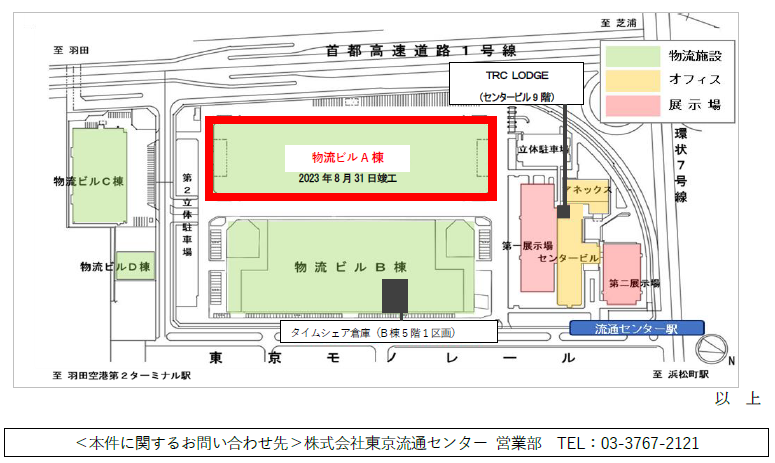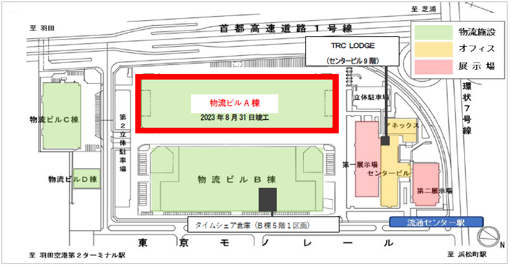 株式会社東京流通センター(以下「TRC」)は1967年から50年以上に亘り東京・平和島にて物流施設(総延床面積:約12万坪)を運営・管理しております。当社敷地内施設の再開発第二弾として地上7階建(1~6階:倉庫+屋上駐車場)・免震構造のマルチテナント型物流施設「物流ビルA棟」(最小約144坪~1フロア約7,800坪、延床面積約61,000坪)が2023年8月31日に竣工を迎えました。そして、このたび、DBJ BCM格付でAランクおよび、DBJ Green Building認証で5つ星と、いずれも最高評価を取得致しましたのでお知らせします。