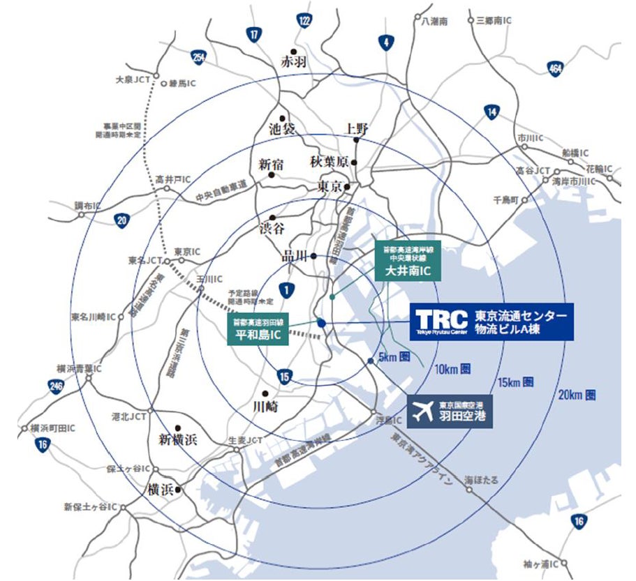 ■東京都心・羽田空港・首都高速ICに近接しており、ラストワンマイル拠点としての活用に加え、国内遠隔地や海外輸出入の拠点としても抜群の対応力を発揮するTC型の物流施設となります。東京モノレール「流通センター」駅徒歩1分かつ、JR「大森」駅、京浜急行「平和島」駅からのバス便も整備されており、雇用優位性も高く物流拠点として最適かつ希少な立地に位置しております。