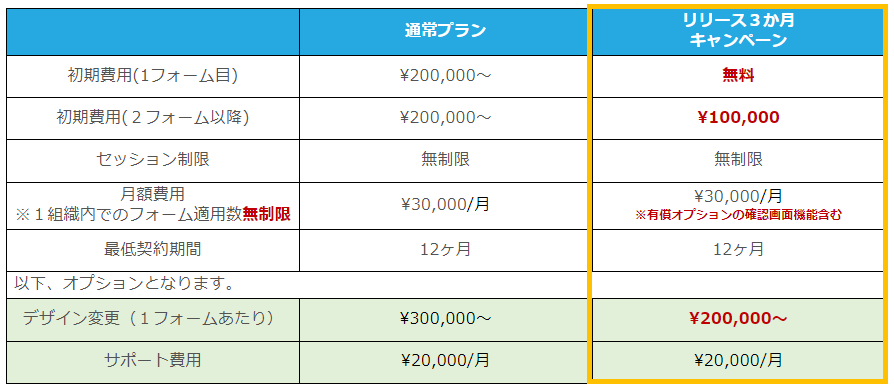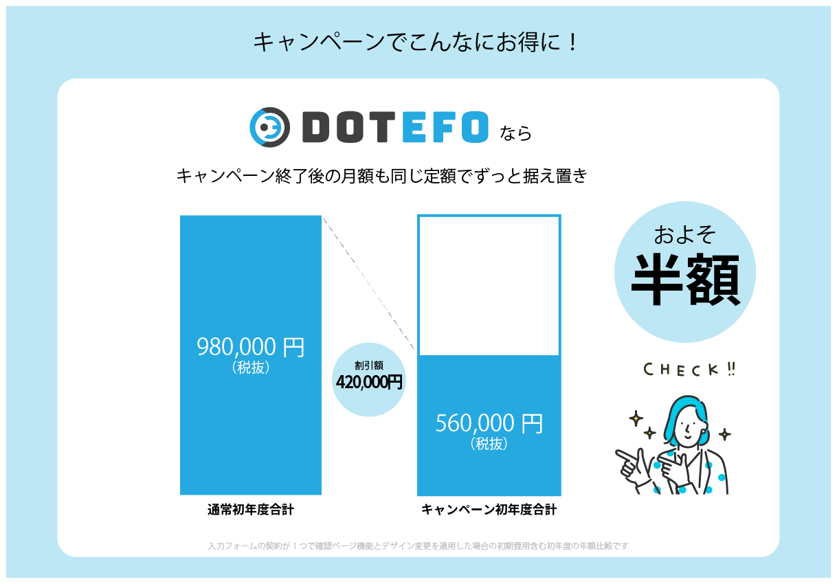 本キャンペーンにお申し込みいただきました方に、弊社が提供する「DOTEFO」のご提供価格として、通常初期費用(1フォーム目)200,000円が無料、有料オプション機能の利用も無料などお得にご提供できるキャンペーンです。