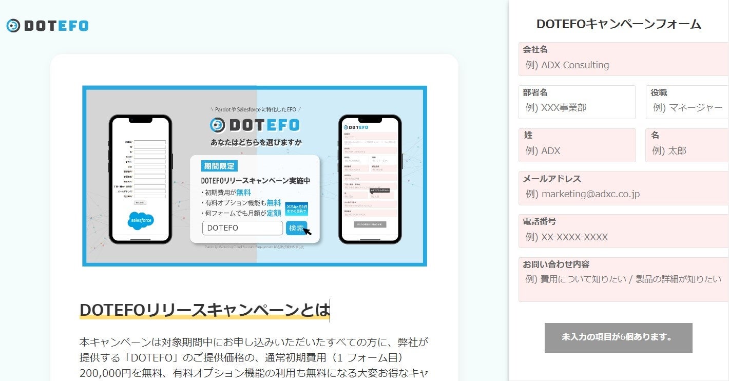 上記キャンペーンフォームは、Account Engagement(旧Pardot)のフォームにDOTEFOを適用し、弊社スペシャリストのデザインを組み込んだフォームとなります。そのため、実際にDOTEFOで最適化されたフォームをご体験頂けます。