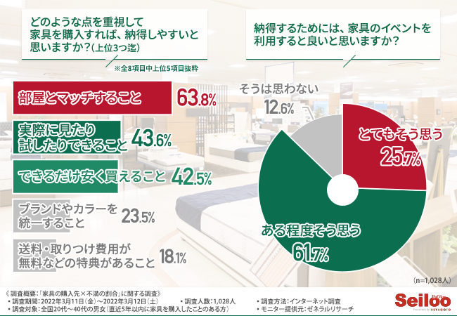 そこで、「どのような点を重視して家具を購入すれば、納得しやすいと思いますか?(上位3つ迄)」と質問したところ、『部屋とマッチすること(63.8%)』と回答した方が最も多く、次いで『実際に見たり試したりできること(43.6%)』『できるだけ安く買えること(42.5%)』と続きました。