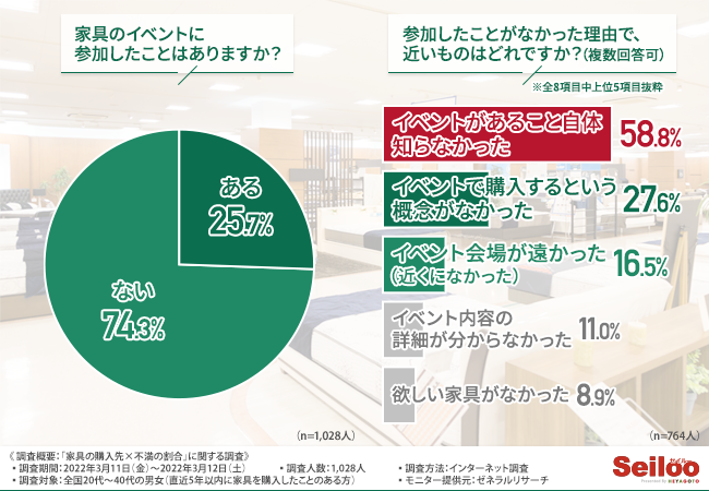 そこで、「家具のイベントに参加したことはありますか?」と質問したところ、『ある(25.7%)』『ない(74.3%)』という結果になりました。