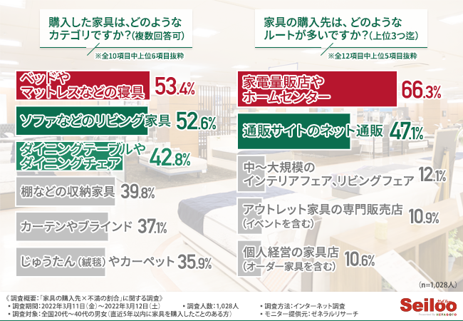 そこで今回、全国の家具アウトレットセール・イベント情報を紹介するポータルサイト『Seiloo(セイルー)』(https://sale.heyagoto.com/)を運営する株式会社ヘヤゴト(https://heyagoto.co.jp/)は、全国20代~40代の男女(直近5年以内に家具を購入したことのある方)を対象に、「家具の購入先×不満の割合」に関する調査を実施しました。