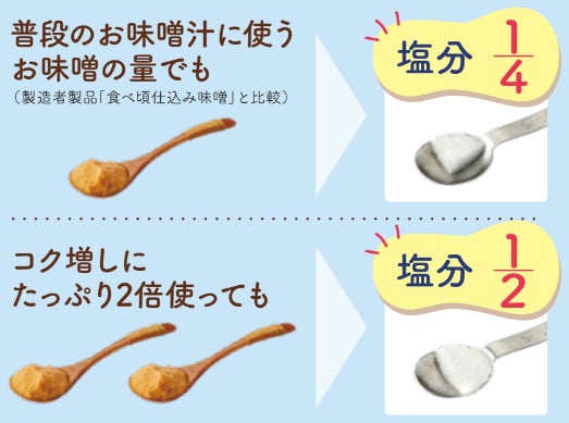 「海塩そみラ」の特徴は塩分4分の1(※注)に加え、塩も海水由来のにがりを含んだ国産の海塩を使用し、塩分濃度も海水の約3.5%に近い3.0%と「海をイメージしたお味噌」、パッケージも水色としています。(※注:製造者商品「食べ頃仕込み味噌(塩分12.0%)」)