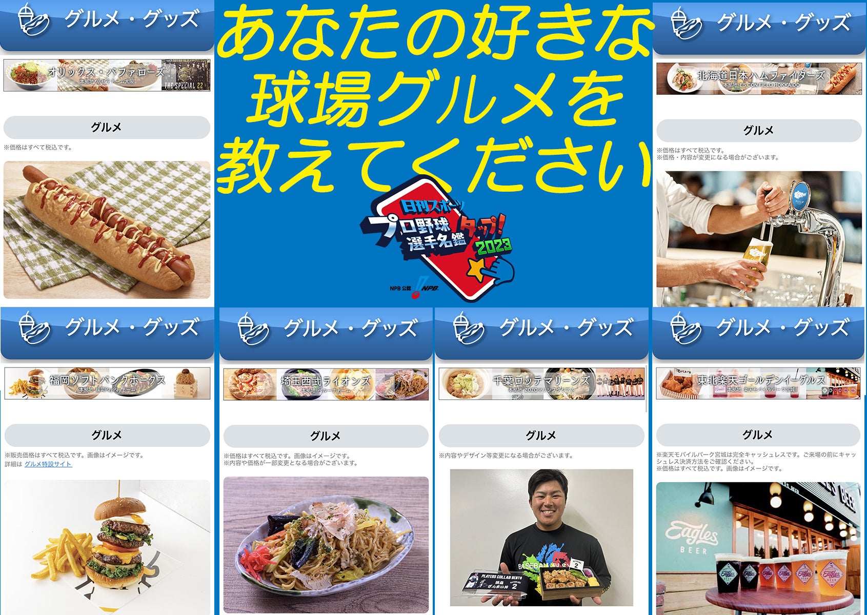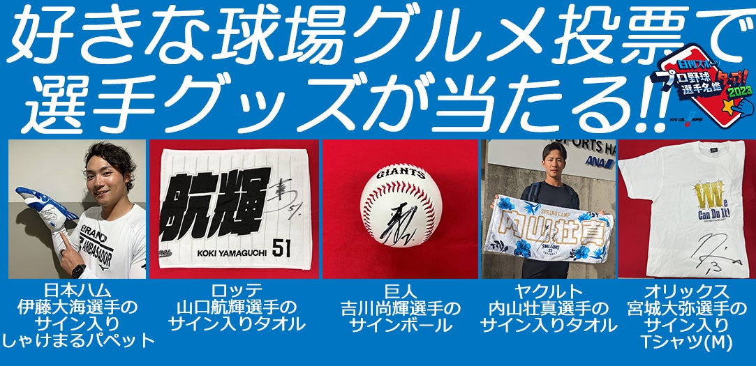 プロ野球選手のサイングッズが当たります! 名鑑タップであなたの好きな球場グルメを投票しよう!!