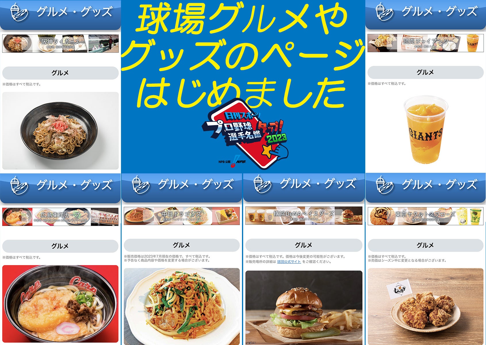 プロ野球観戦のお供に欠かせない球場グルメ。選手の最新成績や球史が簡単にわかる名鑑タップでは、アプリを使うお客様のご要望を受けて、12球団本拠地の主なグルメやグッズ、イベントをまとめたページを新たに追加しました。また、別ページとして、球団マスコットの写真やプロフィールも掲載しました。