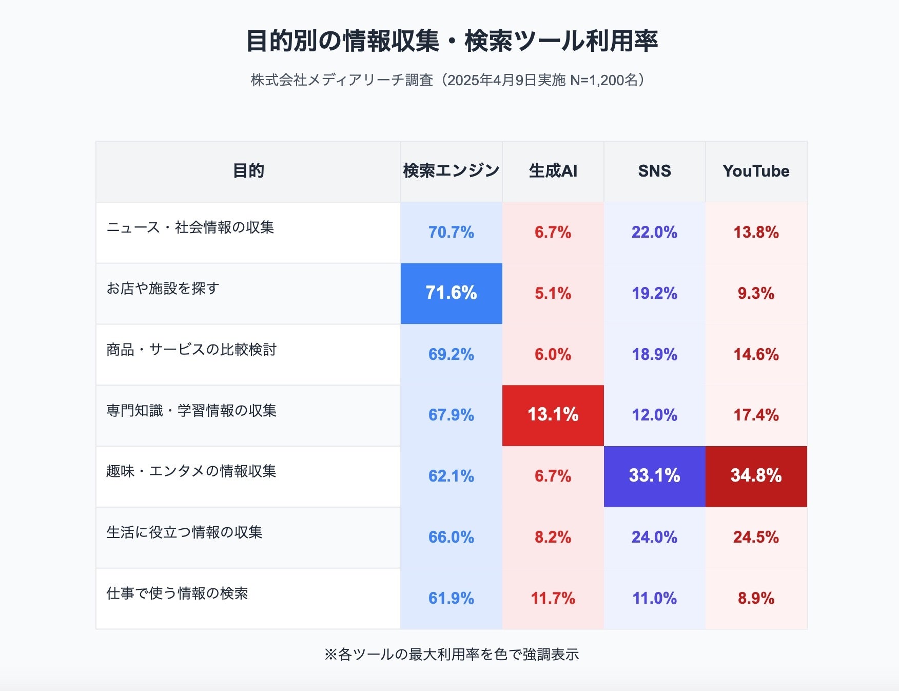 株式会社メディアリーチ、検索エンジン・生成AI・SNS・動画の「使い分け実態」を1,200名に調査──目的ごとに変わる検索行動の新常識とは