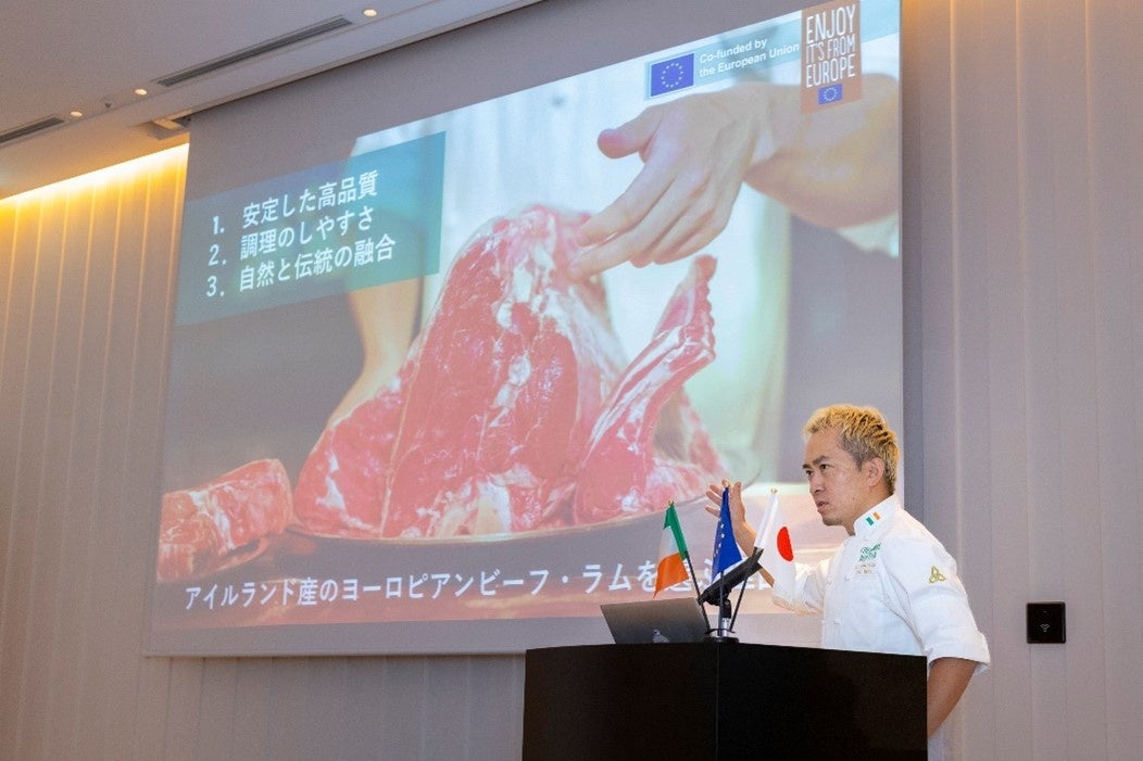 セミナーの最後には、ラ・ビスボッチャの総料理長、井上裕基氏より、同レストランで提供しているアイルランド産のヨーロピアン・ビーフ&ラムの魅力を、料理を通じて日本の消費者にどのように伝えているかについて語りました。本年6月に実際にアイルランドを訪問し、牧場や工場視察から得た実体験をもとに、自然放牧がアイルランドのジューシーで深い味わいが特徴の肉と、いかに密接に関係しているかについても説明しました。