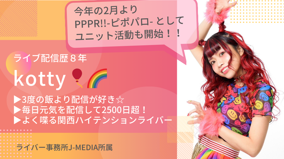 3度の飯より配信が好き!kotty🎈🌈さんが登場!ライバー歴はなんと8年!配信継続日数は2500日超えの、コツコツと努力を続けるライバーさん。関西弁のハイテンショントークで、明るく楽しくみんなでもりあがるライブ配信を作っていってくれそうですね!