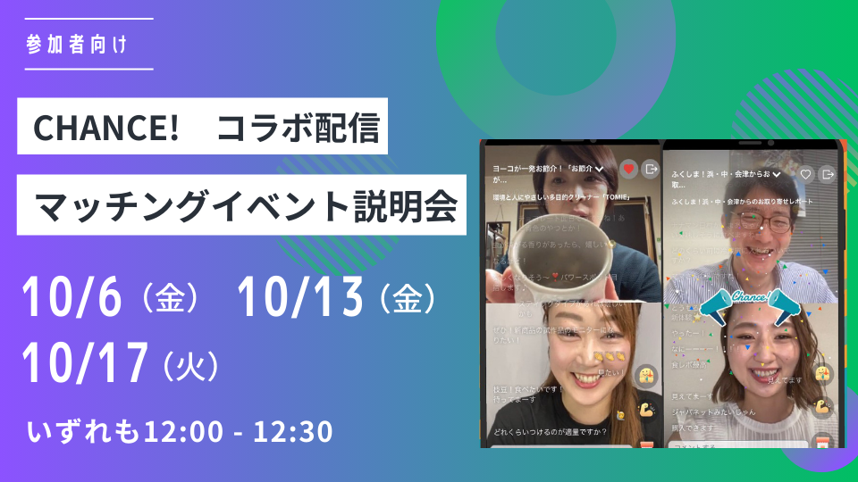 CHANCE!で新たなコラボレーションの扉を開きませんか?またこのマッチングイベントは10月、11月も引き続き開催します!!