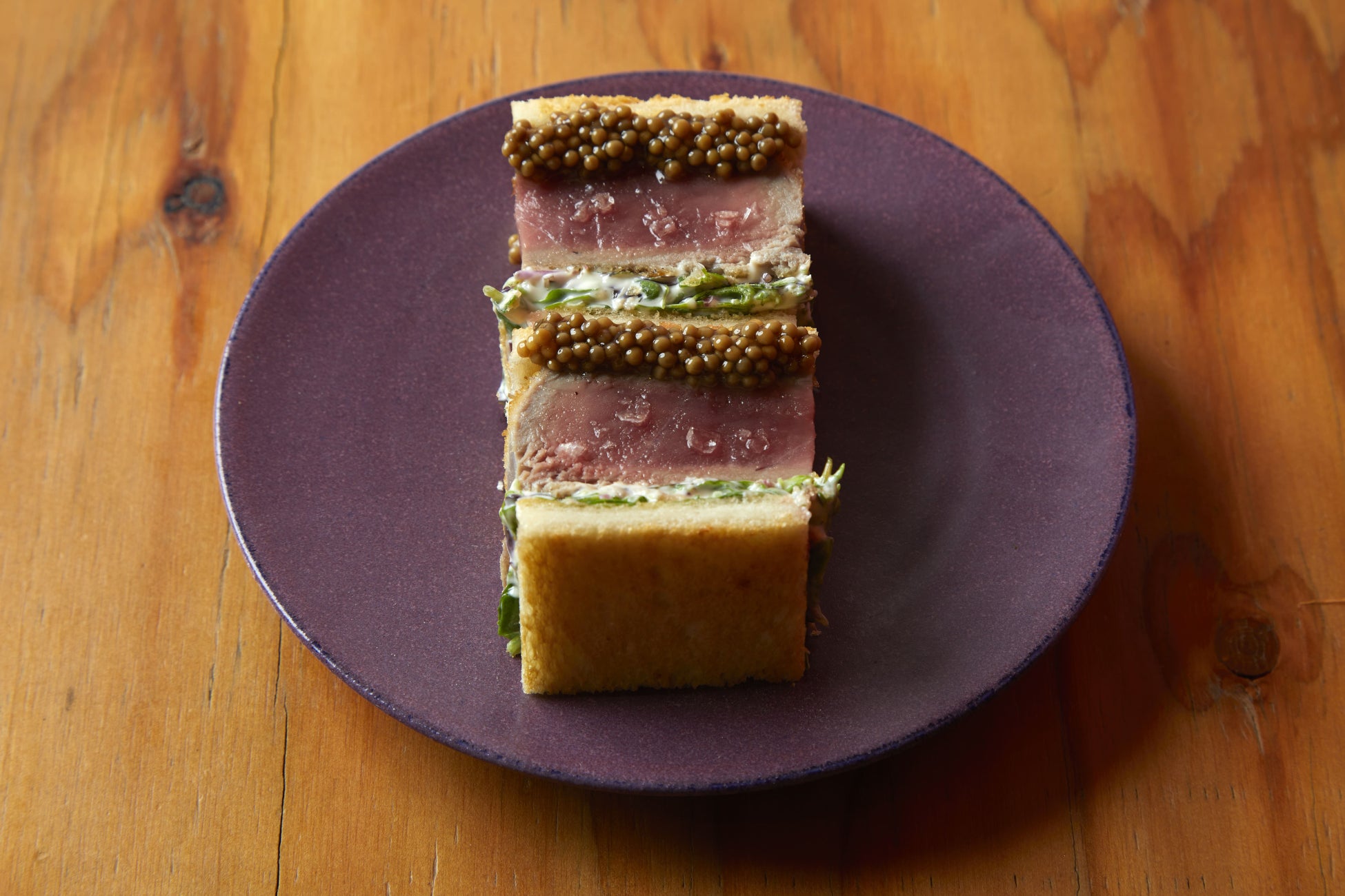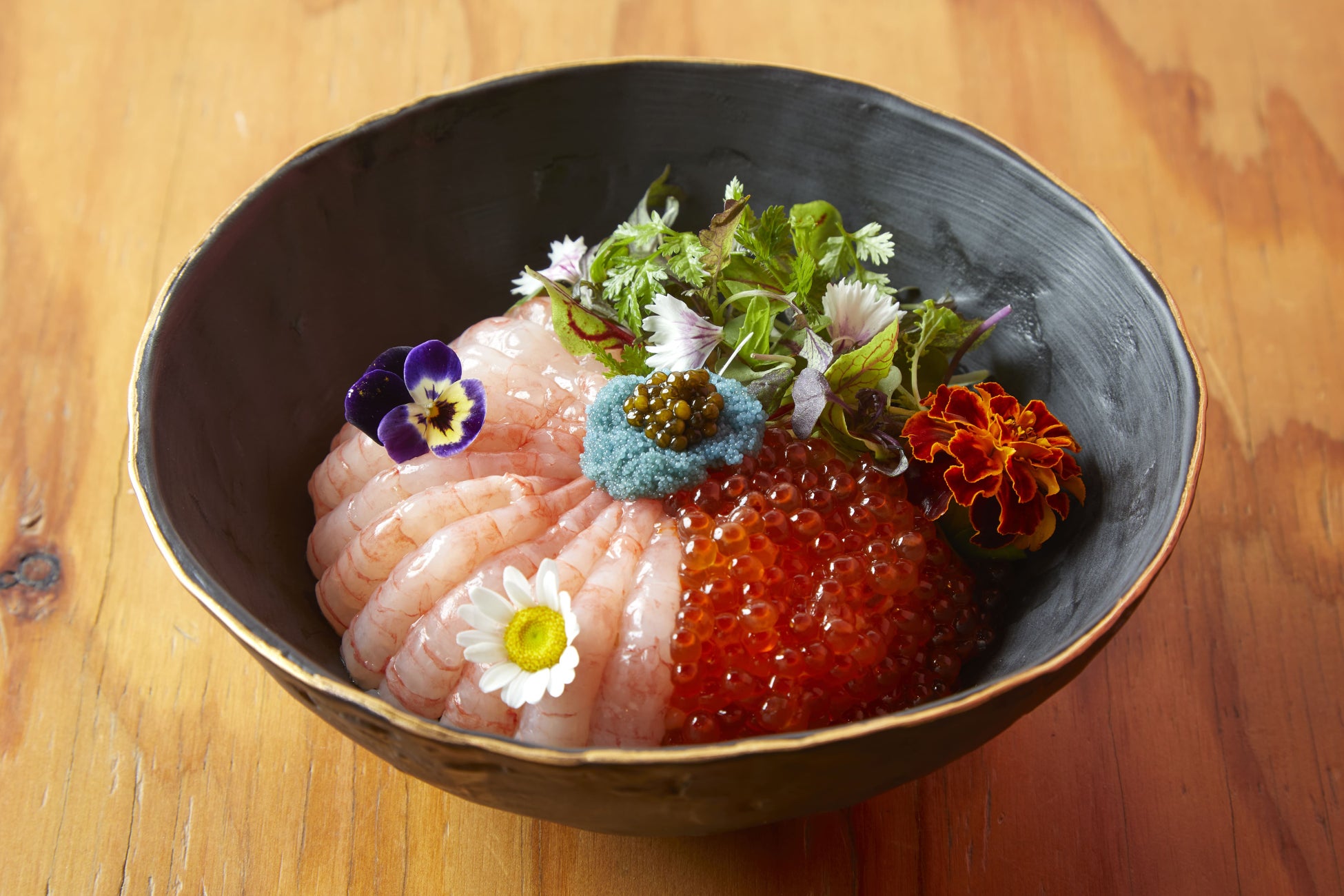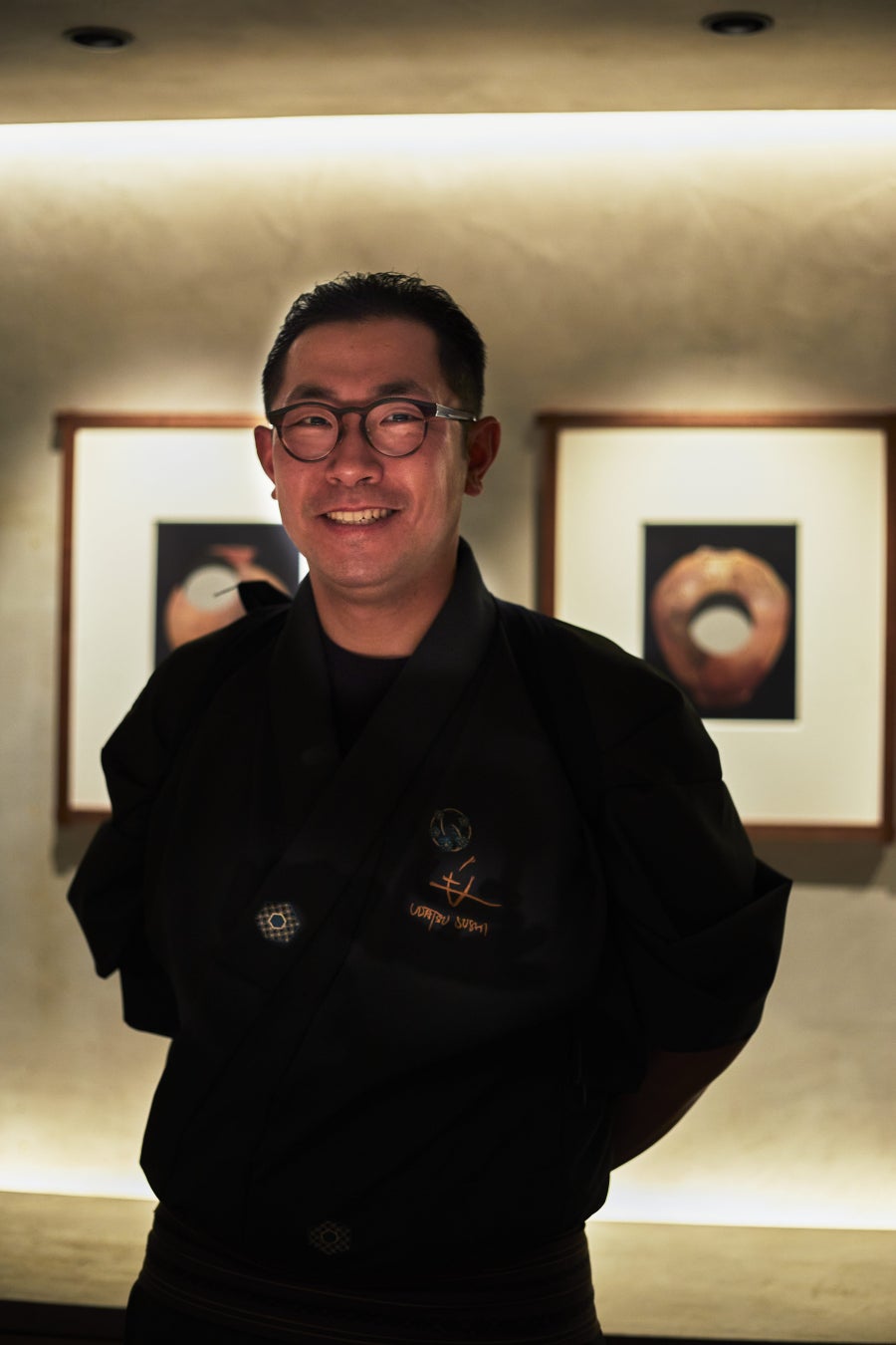 東京国立の肉屋の息子として生まれ育った宇田津は、幼少期から近所にあった寿司屋に通い、大将に寿司を学んでいました。神田、銀座、西麻布の寿司屋で15年間の修行をした後、2019年に中目黒にオーナーシェフとして「宇田津鮨」を開業。アートギャラリーをモチーフにしたお店では、宇田津の看板メニューでもある季節の魚を使用したハーブ巻きとマグロの燻製をはじめとしたオリジナルメニューが提供され、国内外から多くのお客様を惹きつけるレストランです。2022年にミシュラン1つ星を獲得しました。