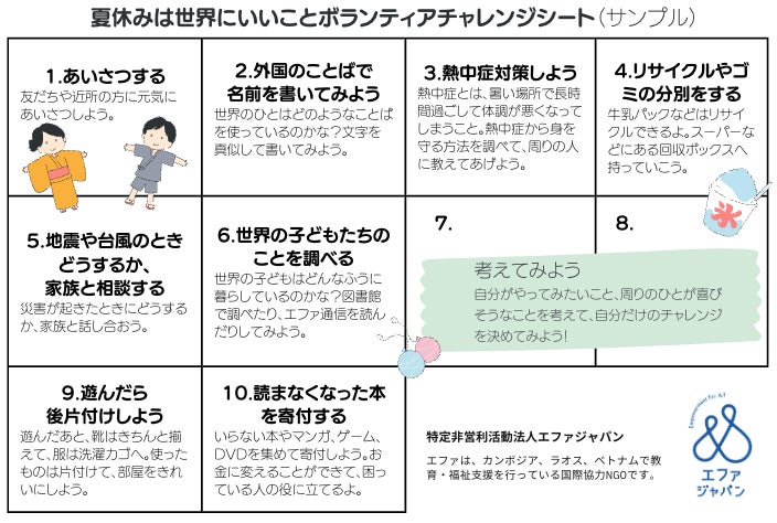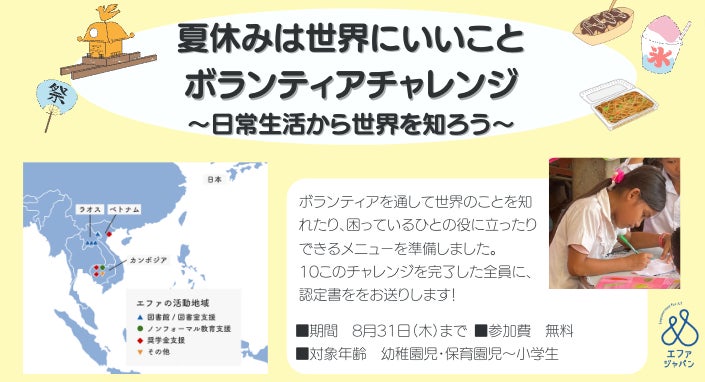 この度、エファジャパン(以下、エファ)は、夏休みに子どもたちが取り組めるボランティアプログラムとして、「夏休みは世界にいいことボランティアチャレンジ」を企画しました。