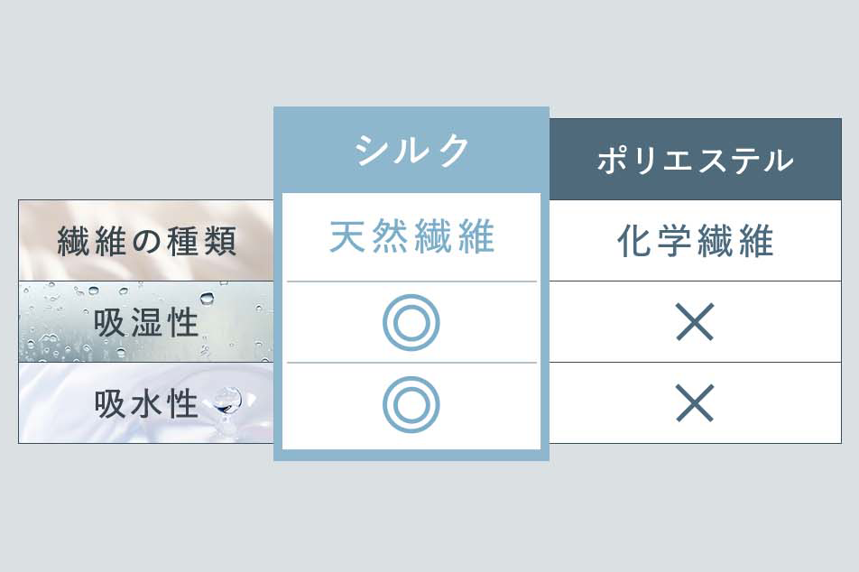 一方、たんぱく質でできた天然繊維のシルクは人肌との相性が抜群。肌なじみが良く、化繊負けを引き起こさないため、敏感肌の方でもお使いいただけます。