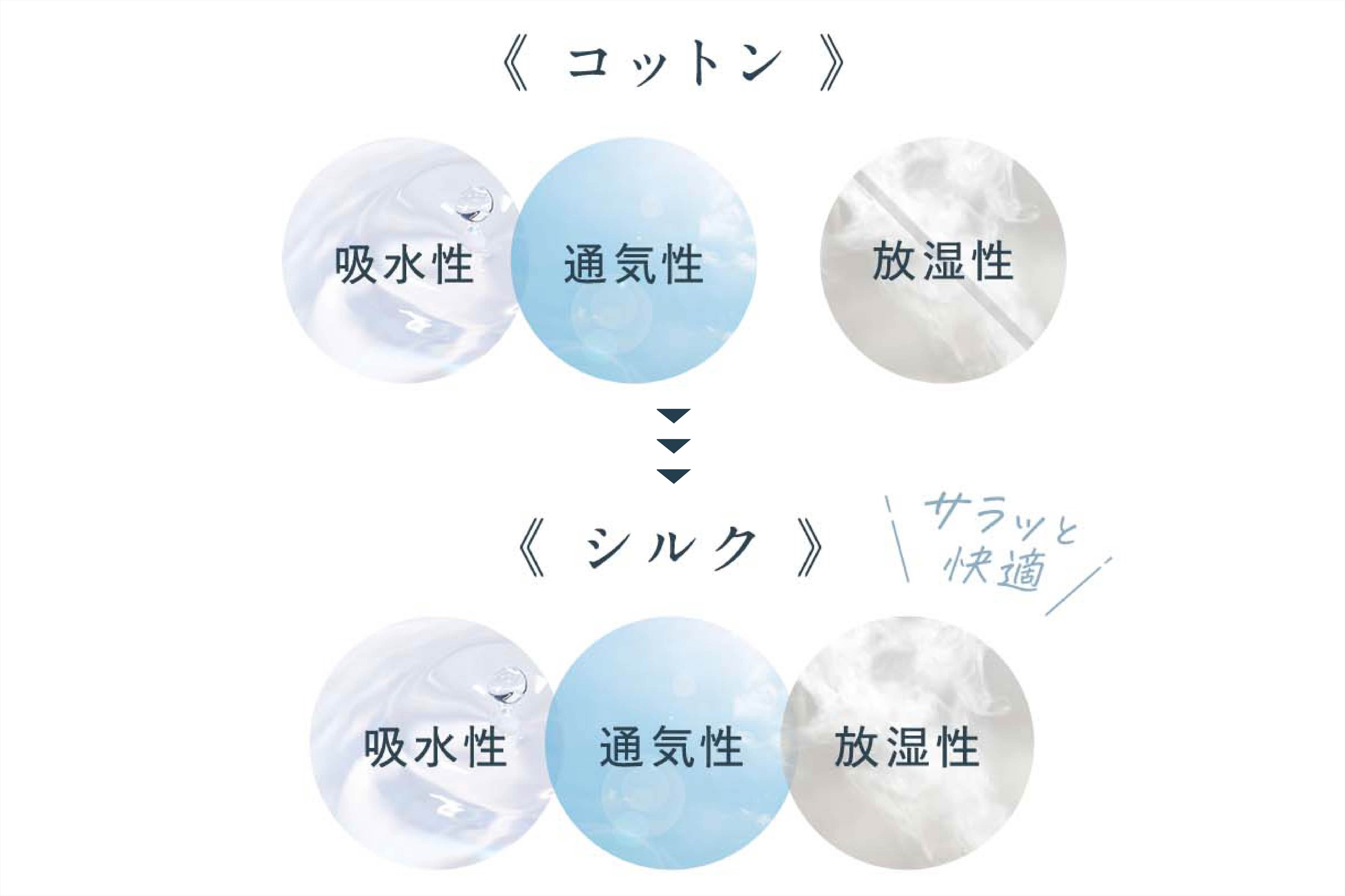 保湿性も兼ね備えるシルクは、余分な水分を外に出しつつも、肌表面のうるおいはキープします。肌をしっとりと守ってくれるため、乾燥肌の方にもおすすめです。
