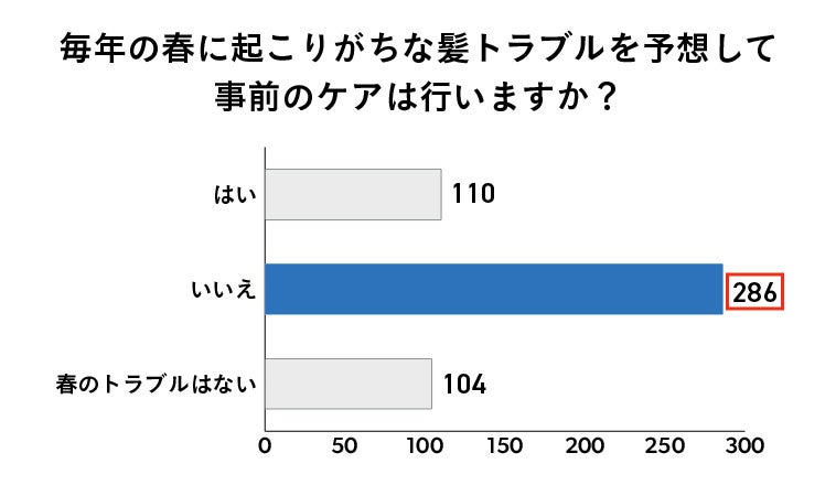一方で、500人中の約6割、春に髪トラブルを感じない人を母数から抜いた場合は約72%は事前のケアを行わないということが分かります。
