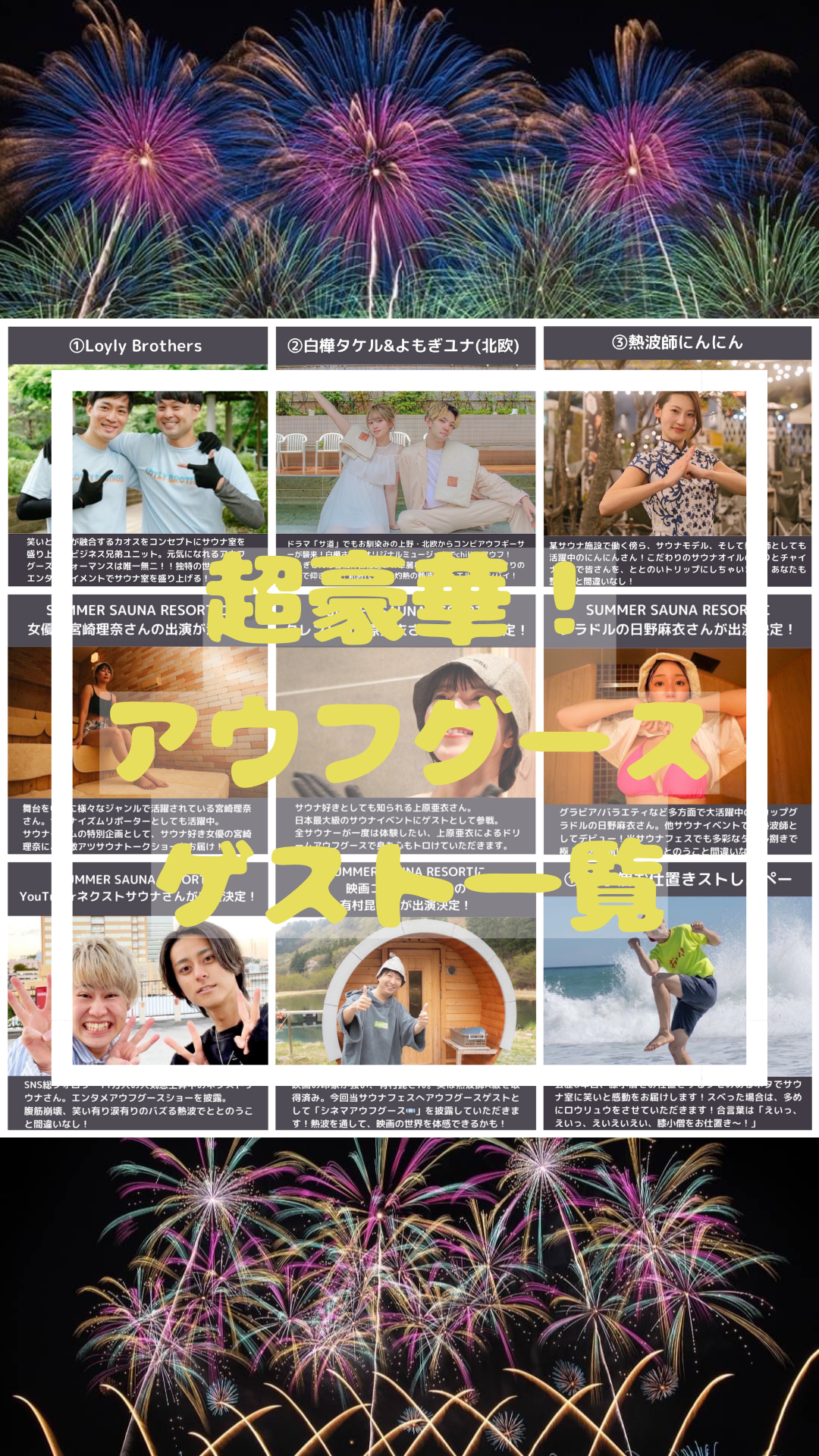 1DAYサウナチケット1,000枚完売間近!日本最大級のサウナフェス 「SUMMER SAUNA RESORT」 in 大洗海上花火大会 見どころコンテンツ&出演者紹介!