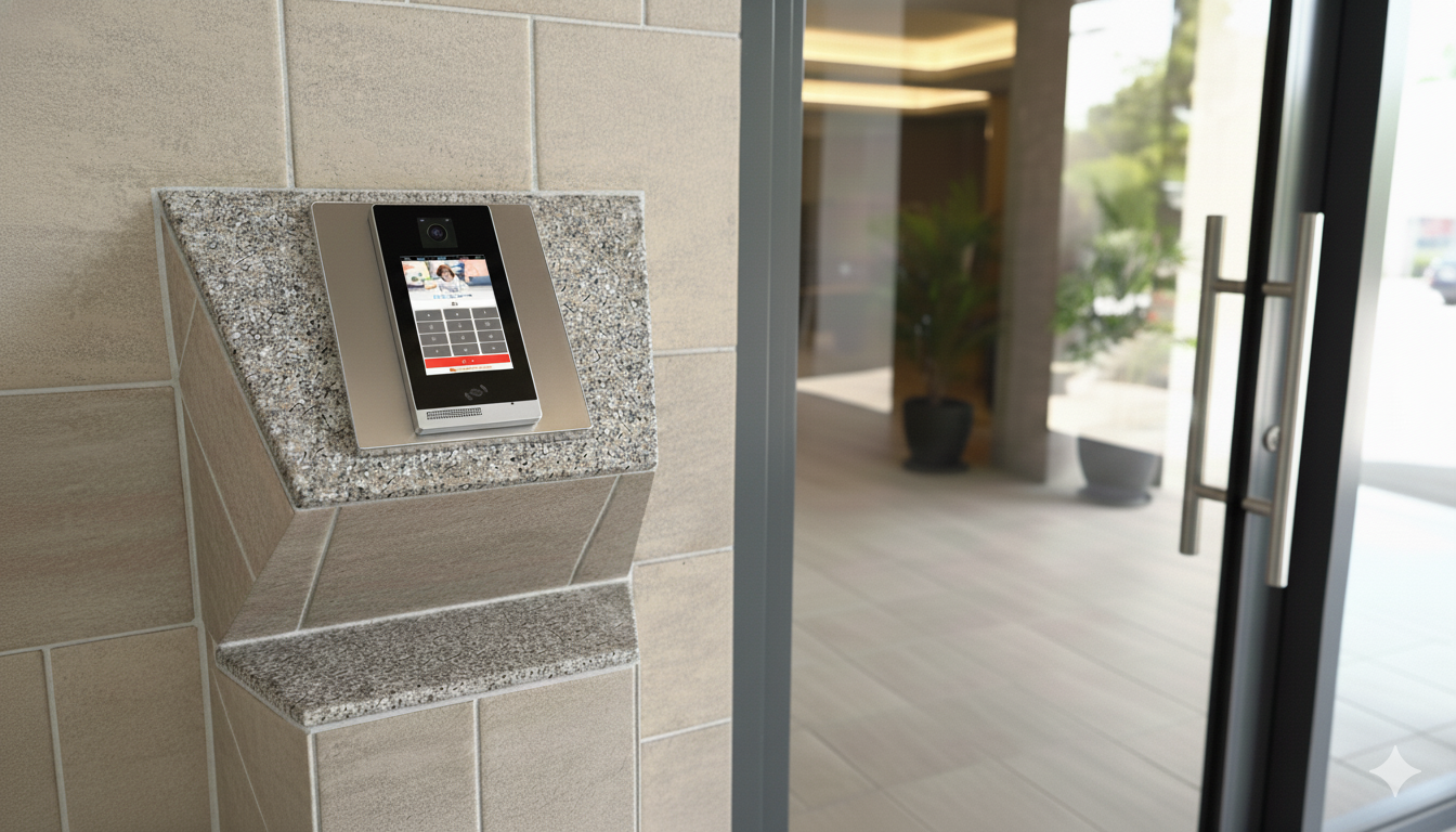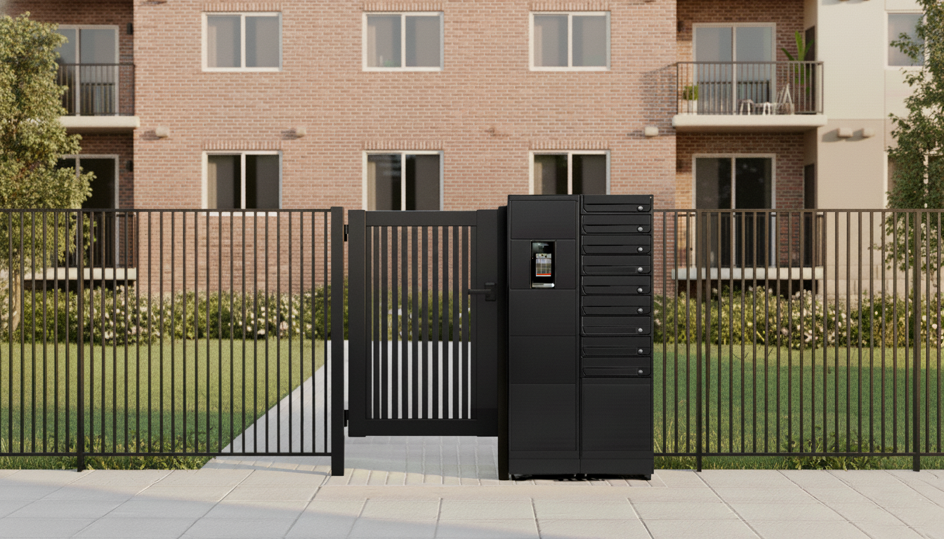 市販の門扉に電子錠を取り付け、スマートインターホンと連動させることで、大がかりな工事なしでオートロック化を実現します。宅配ボックスやポストも一体型で導入でき、低コストで集合住宅のセキュリティを向上させます。