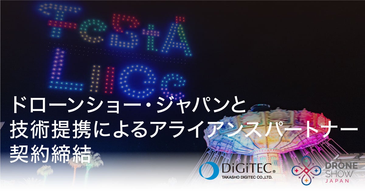 株式会社タカショーデジテック(本社:和歌山県海南市、代表取締役社長 :古澤良祐、以下「当社」)は、国内ドローンショー実績No.1※の株式会社ドローンショー・ジャパン(本社:石川県金沢市、代表取締役:山本雄貴、以下「ドローンショー・ジャパン社」)と技術提携によるアライアンスパートナー契約を締結いたしましたことをお知らせいたします。