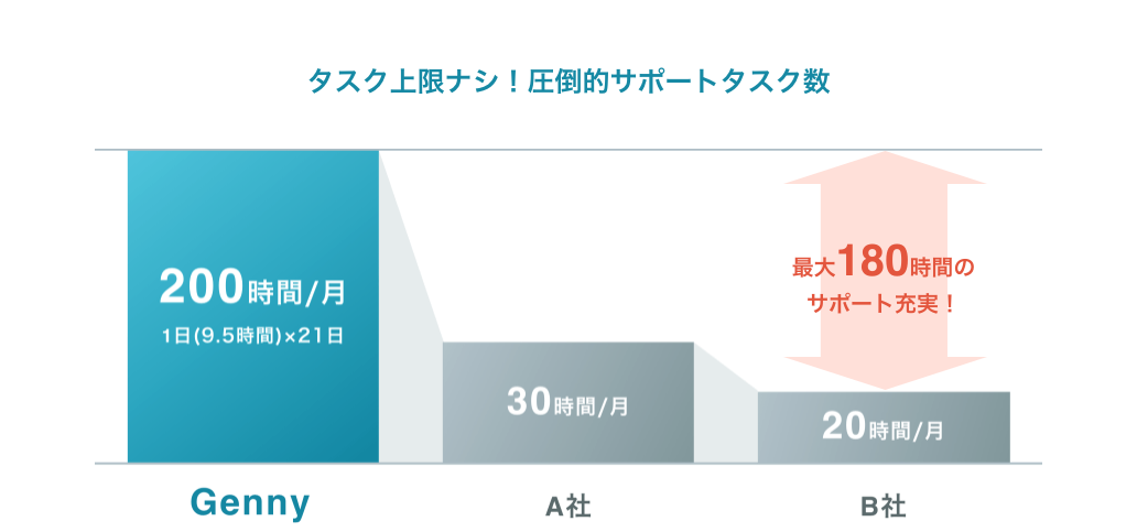 多くのオンライン秘書サービスは業務量・時間に応じて料金が決まりますが、Gennyは上限がありません。一般的な秘書業務にとどまらず、お客様の御要望に合せた業務のご提供も可能です。どういったお仕事をGennyに任せたいとお考えか、お気軽にお申し付けくださいませ。