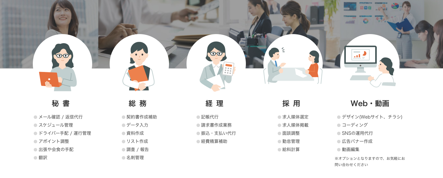 秘書業務だけにとどまらず、「総務」「経理」「人事」「Web・動画」と幅広い分野のご依頼についても対応可能です。Gennyで対応できる業務なのか疑問に思いましたら、お気軽にご連絡ください。パソコンが苦手な方でも安心してご依頼いただけます。 ご要望にあわせて、業務を遂行してまいります。