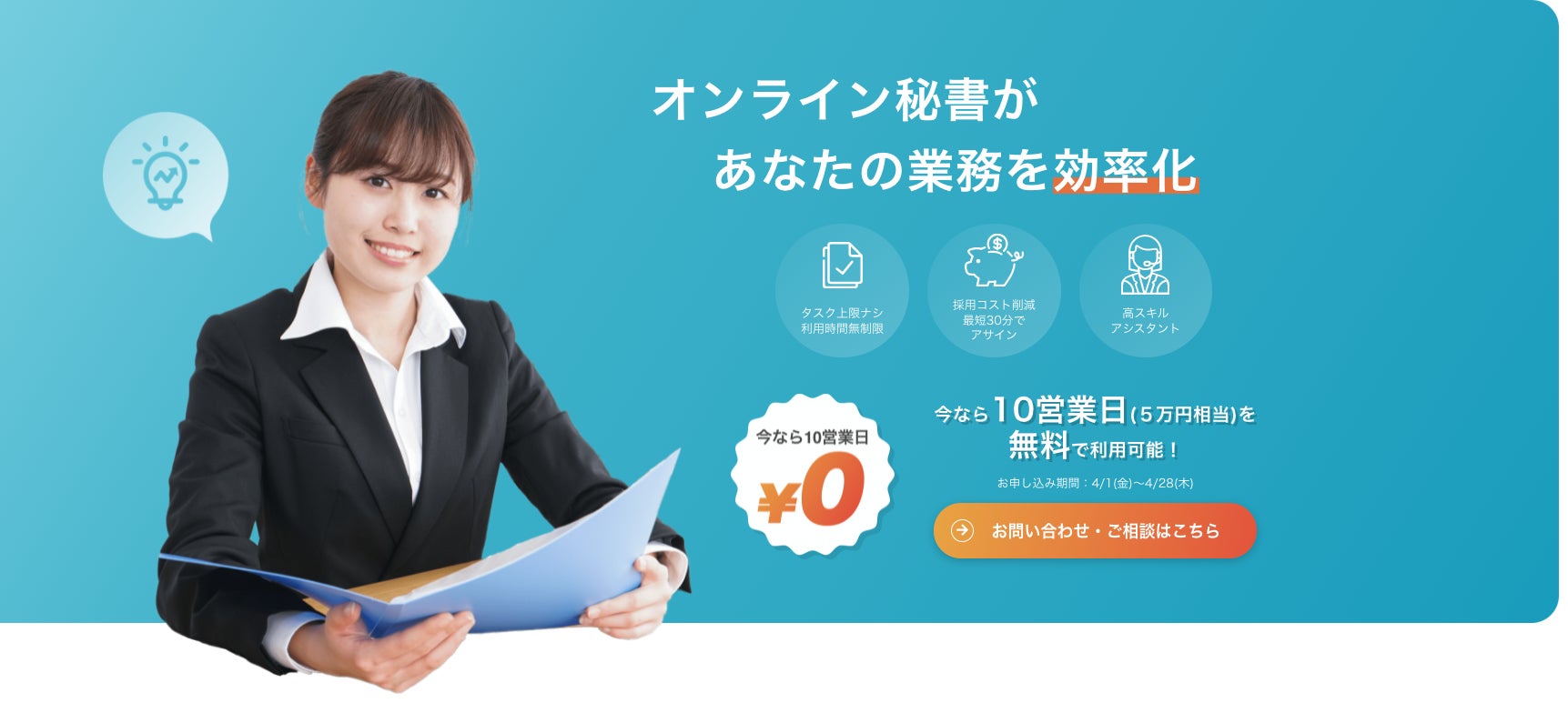 4月1日(金)〜4月28日(木)までのお申込者様限定で、今なら優秀な秘書を10営業日/タスク上限なし0円でご利用頂けます。