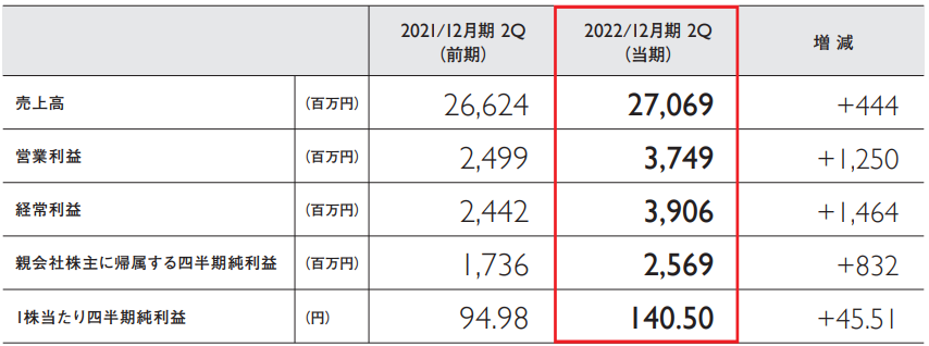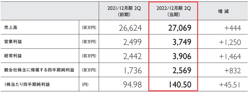売上高27,069百万円(前年同期比444百万円増)、営業利益3,749百万円(同1,250百万円増)、経常利益3,906百万円(同1,464百万円増)、親会社株主に帰属する四半期純利益2,569百万円(同832百万円増)となり、売上高、営業利益、経常利益、四半期純利益のすべてにおいて、2021年12月期第2四半期連結決算を上回る結果となりました。