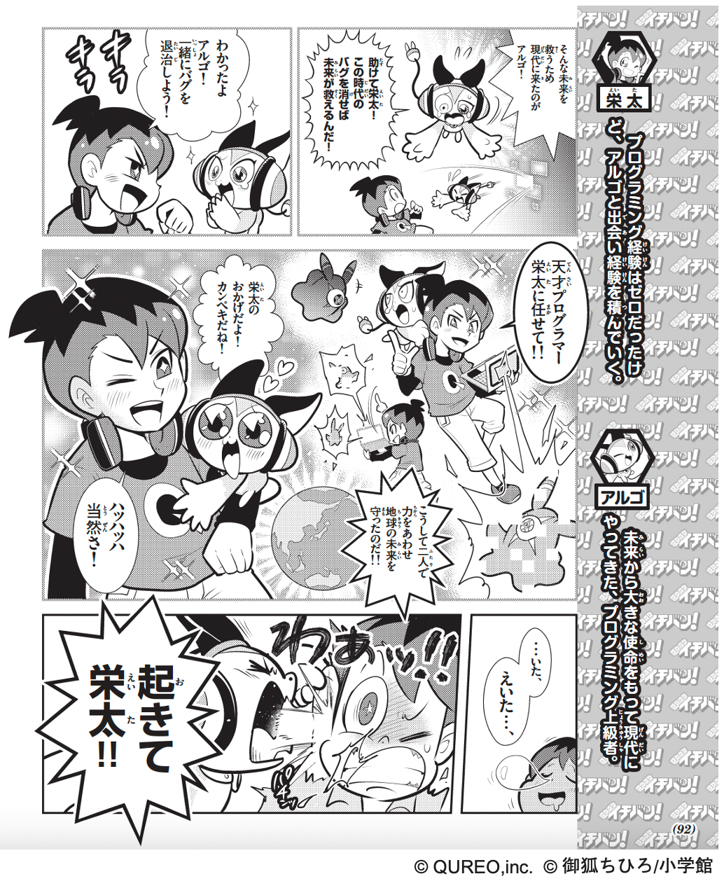 作中には、「QUREOプログラミング教室」が提供する学習教材のガイドキャラクターである「アルゴ」が登場し、教材と同じ世界観のなかで主人公とプログラミングに取り組みます。