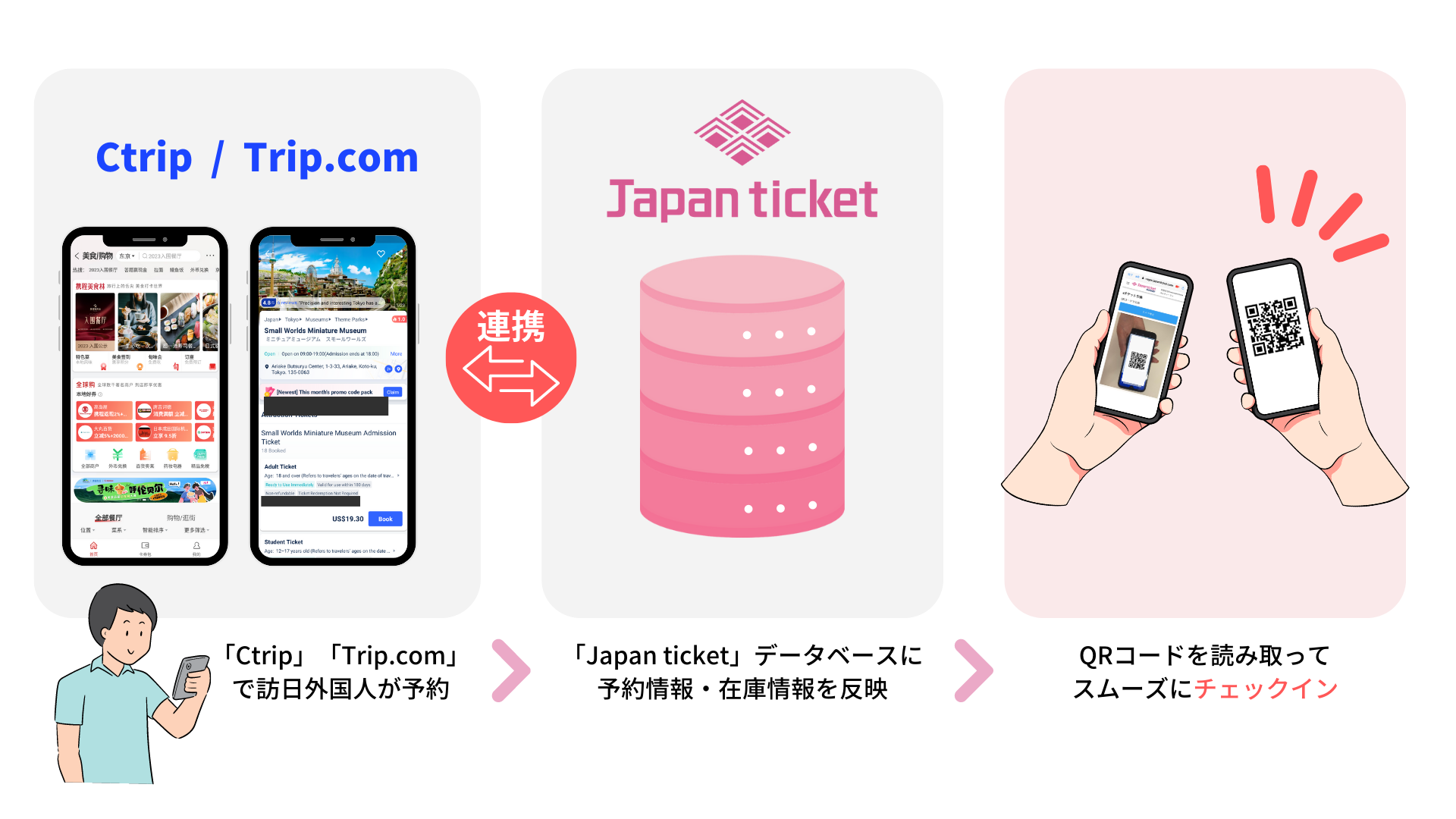 今回のAPI連携により、飲食店ではコースチケット、入場施設では入場券、アクティビティでは体験チケットといったように、さまざまな日本の観光体験を「Ctrip」「Trip.com」で販売可能となり、中国を中心に世界中の約4億人のユーザーに配信することができます。「Japan ticket」を通して「Ctrip」「Trip.com」に掲載したチケットは、事前決済による即時予約に対応しているため、ユーザーの予約情報は即時データベースに反映され、事業者は煩雑な在庫確認の手間なく効率的な予約管理が可能となります。